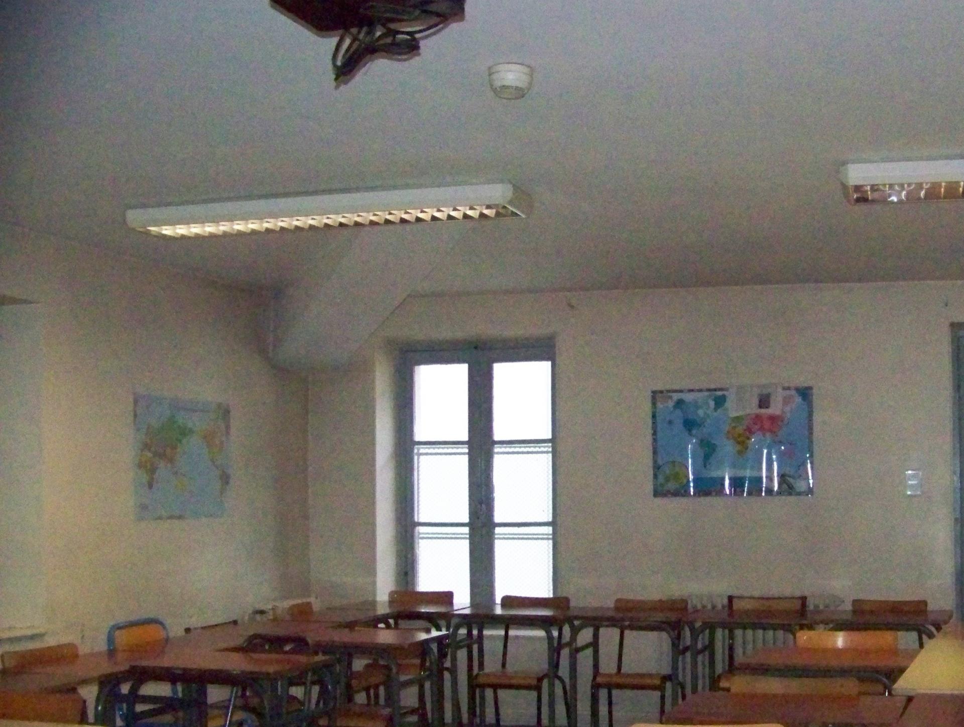 In the classroom there are posters and windows, but there is no videoprojector